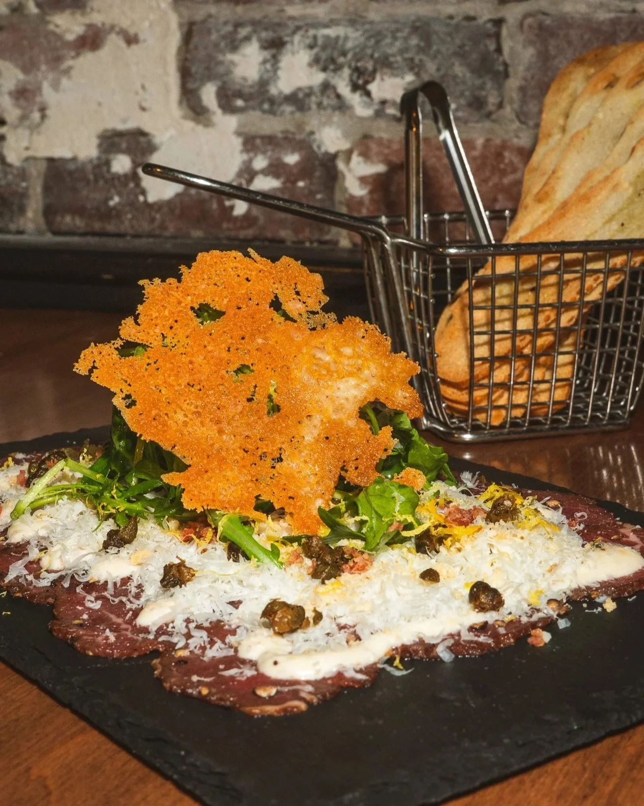 thinly slicced AAA tenderloin, creamy caesar dressing, panko-parmesan crisp, friend capers, shredded asiago, thinly sliced baguette crostini