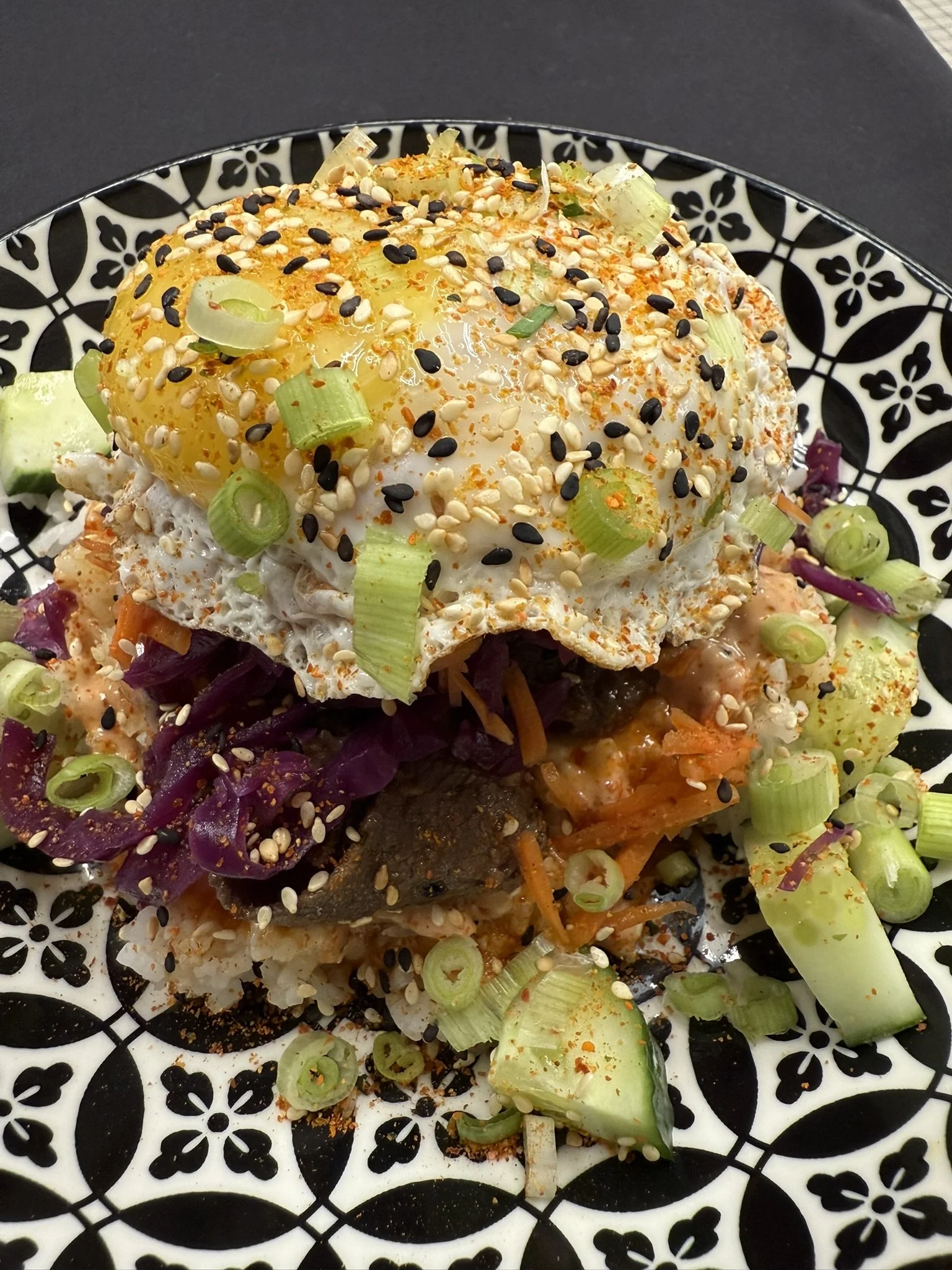 shaved striploin steak, sticky rice, sunnyside egg, pickled carrots, cucumber, braised cabbage, spring onion, gochujang aioli, sesame