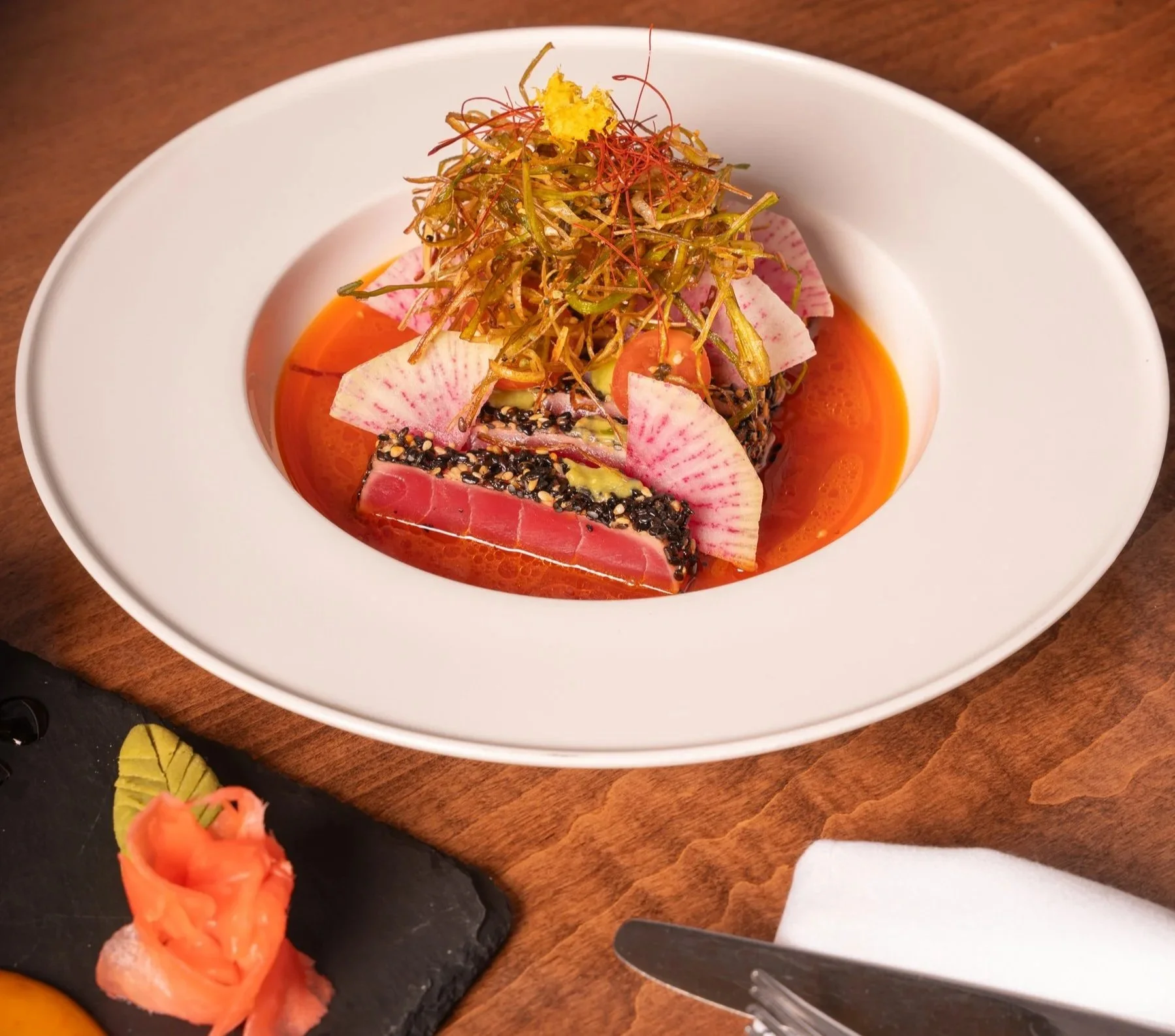 avocado purée, grape tomato, orange ponzu, crispy onion leeks, lemon zest, chili threads, watermelon radish, maldon salt