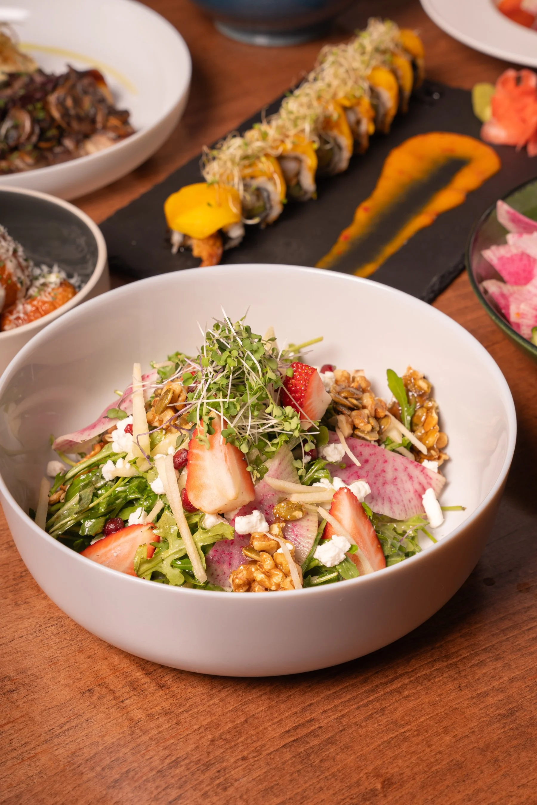 apple slaw, arugula, pomegranate, walnut brittle, goat cheese, watermelon radish, maple dijon vinaigrette