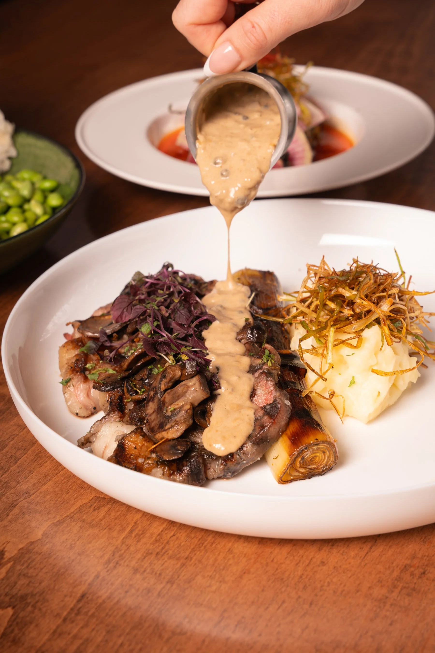 AAA striploin, wild mushroom, crispy + charred leeks, cognac pepper reduction, truffle parm purée
