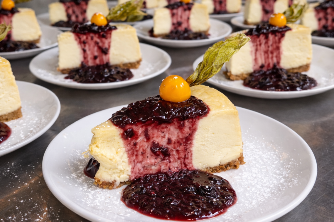 Our rich and creamy New York-style cheesecake, baked to perfection with a buttery graham crust. Finished with a rotating selection of seasonal flavours.