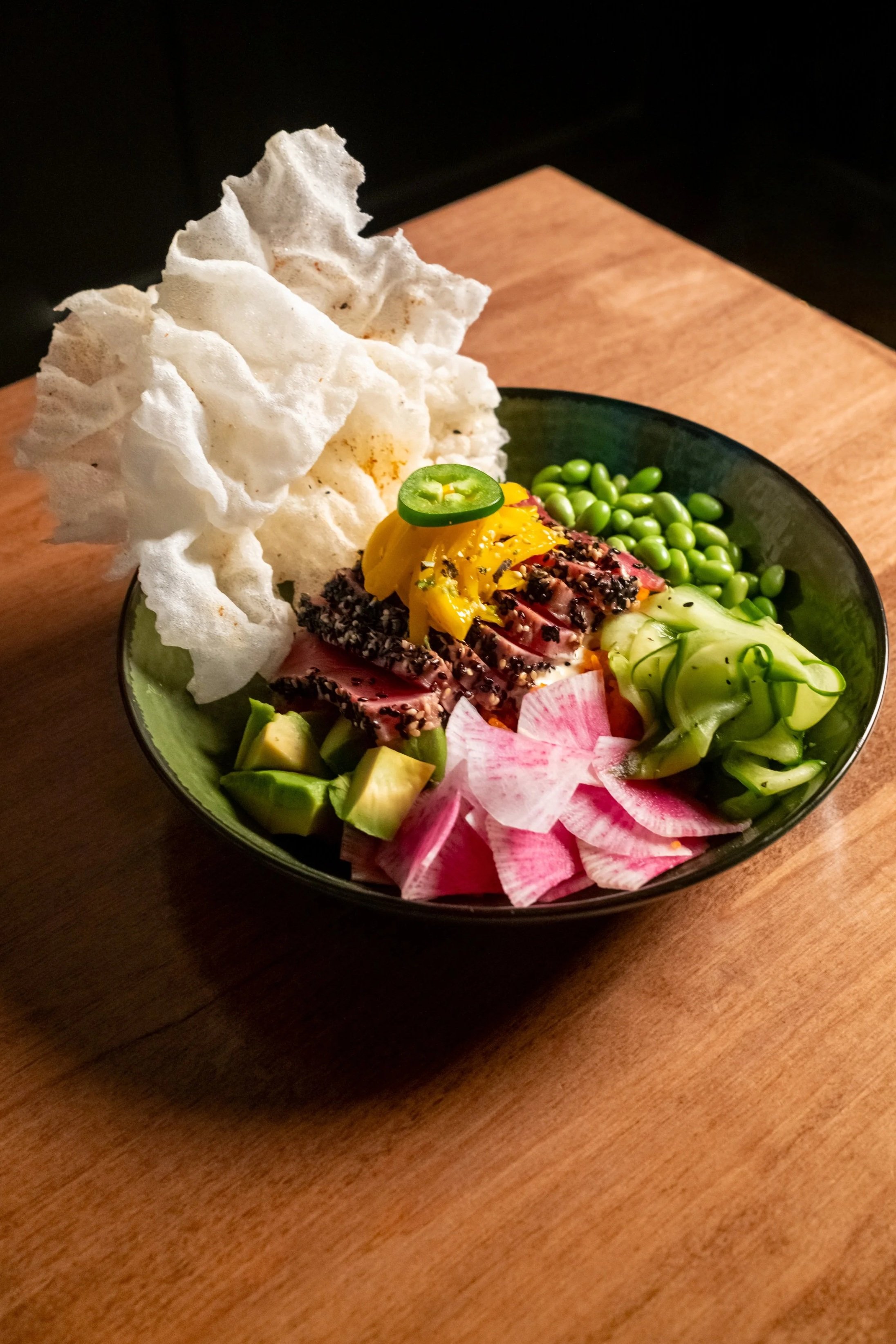 marinated ahi tuna, mango, avocado, pickled cucmber ribbon, edamame, watermelon radish, gochujang rice, jalapeño aioli, rice paper crisp